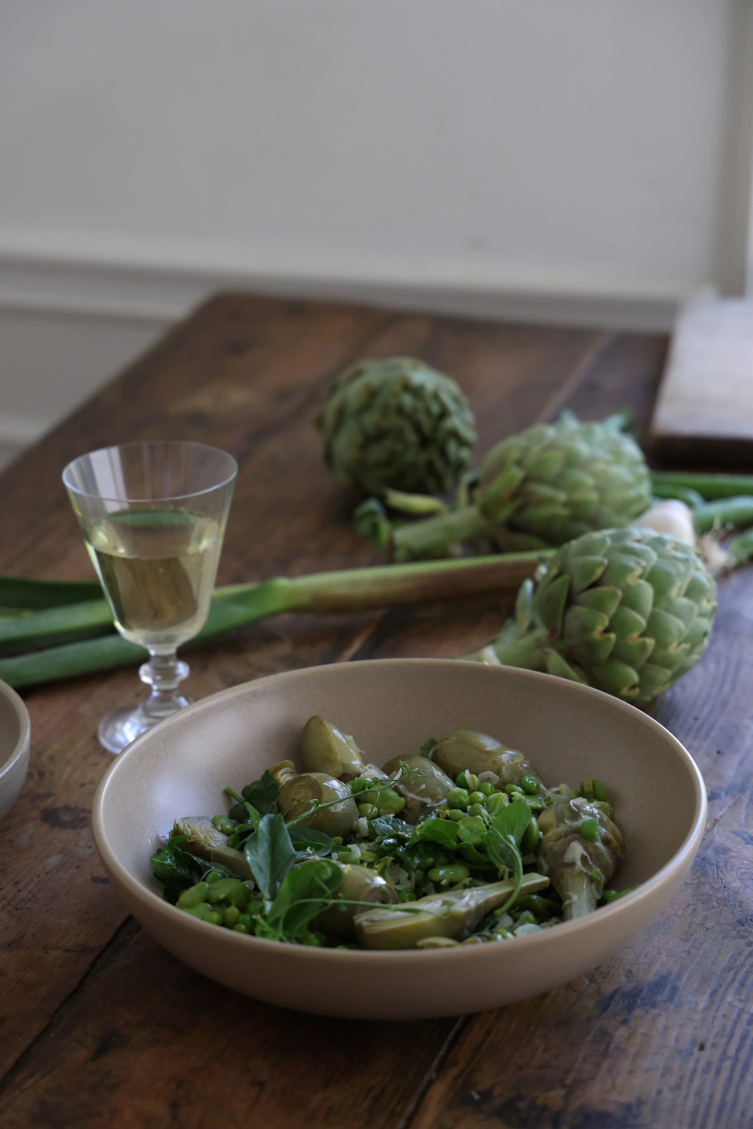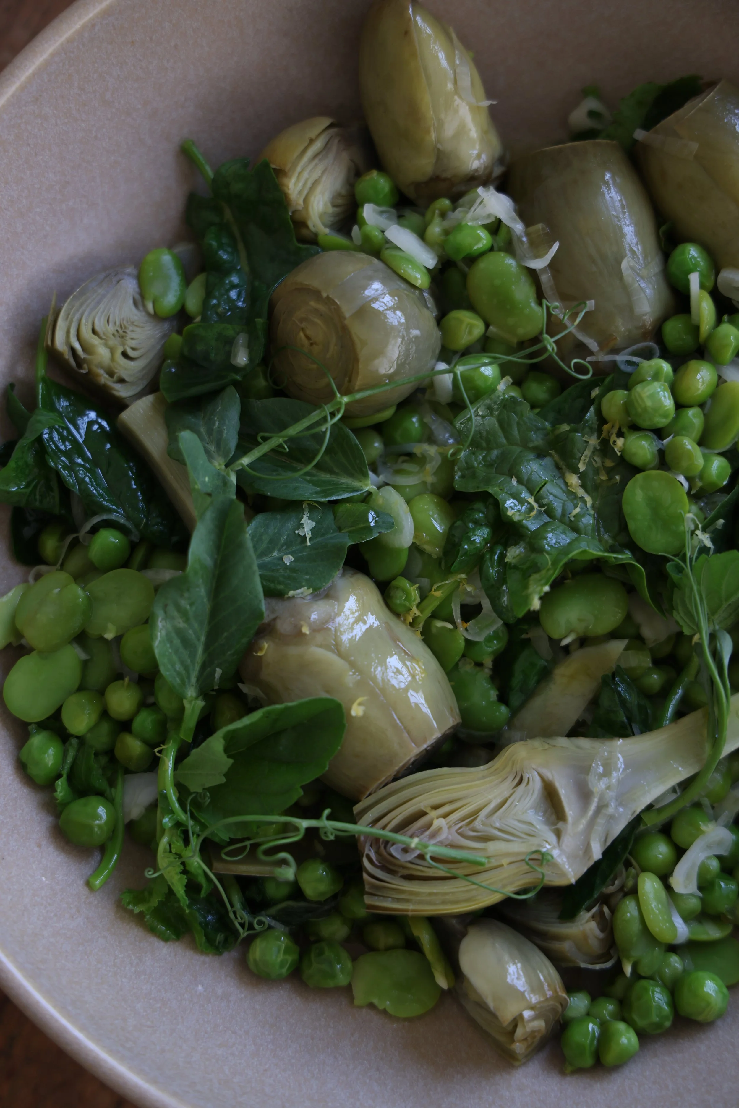 Vignarola is a Roman dish that is a celebration of spring vegetables : artichokes, fava beans, and English peas. Lots of fresh herbs and lemon make it bright and fresh!